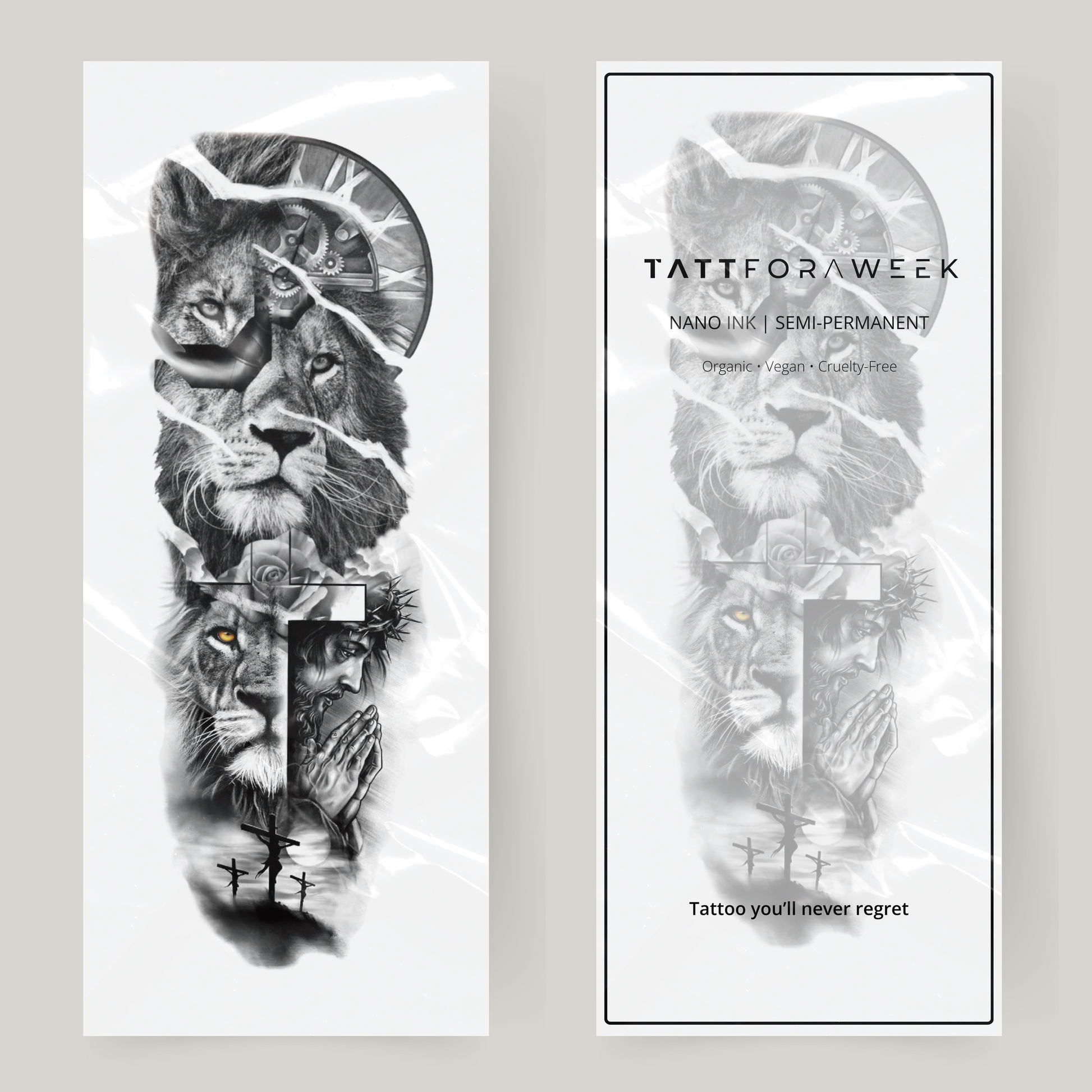 Fałszywy tatuaż na rękawie z lwem, wiarą i zegarem