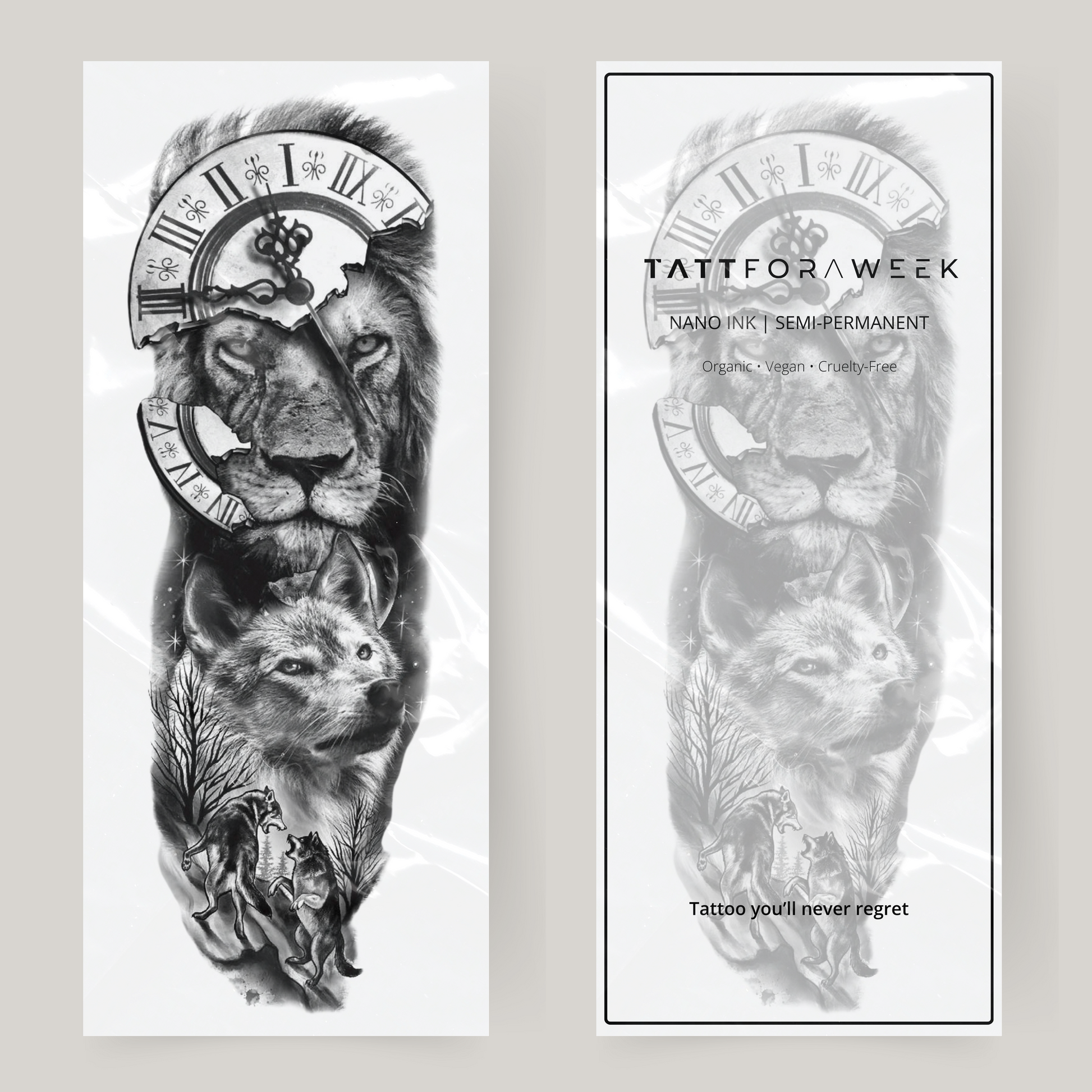 ✓ Szczegółowe. Ogromny, przezroczysty rękaw z tymczasowym tatuażem z widocznymi detalami.
